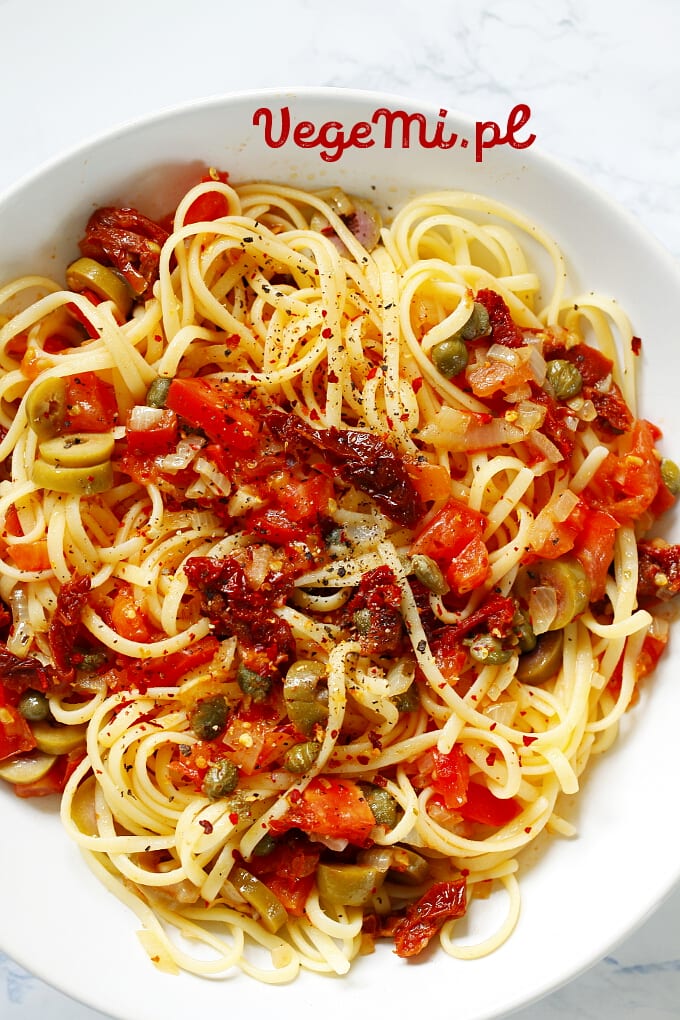Cała moja rodzina zjadła dzisiaj ze smakiem mój wegański sos puttanesca tym razem nie spaghetti puttanesca ale fettuccine. Jeżeli lubisz makaron taki jak spaghetti z suszonymi pomidorami, oliwkami, kaparami, czosnkiem i innymi składnikami, typowymi dla sosu do puttanesca, to ten przepis jest dla ciebie. Ponieważ moi rodzice bardzo lubią suszone pomidory i oliwki, uznałam że taki właśnie szybki w przygotowaniu i smaczny makaron będzie na dzisiaj idealny. Z jakimi dodatkami najbardziej lubisz makaron? Ja lubię z najróżniejszymi! Między innymi lubię też z sosem pomidorowym, bo w końcu kto go nie lubi? Dlatego właśnie dodałam do mojego sosu puttanesca także świeże pomidory. Możesz także dodać pomidory z puszki, ale ja wolałam użyć świeżych i soczystych, tak bardziej tradycyjnie. Zapraszam na przepis na mój wegański sos puttanesca.